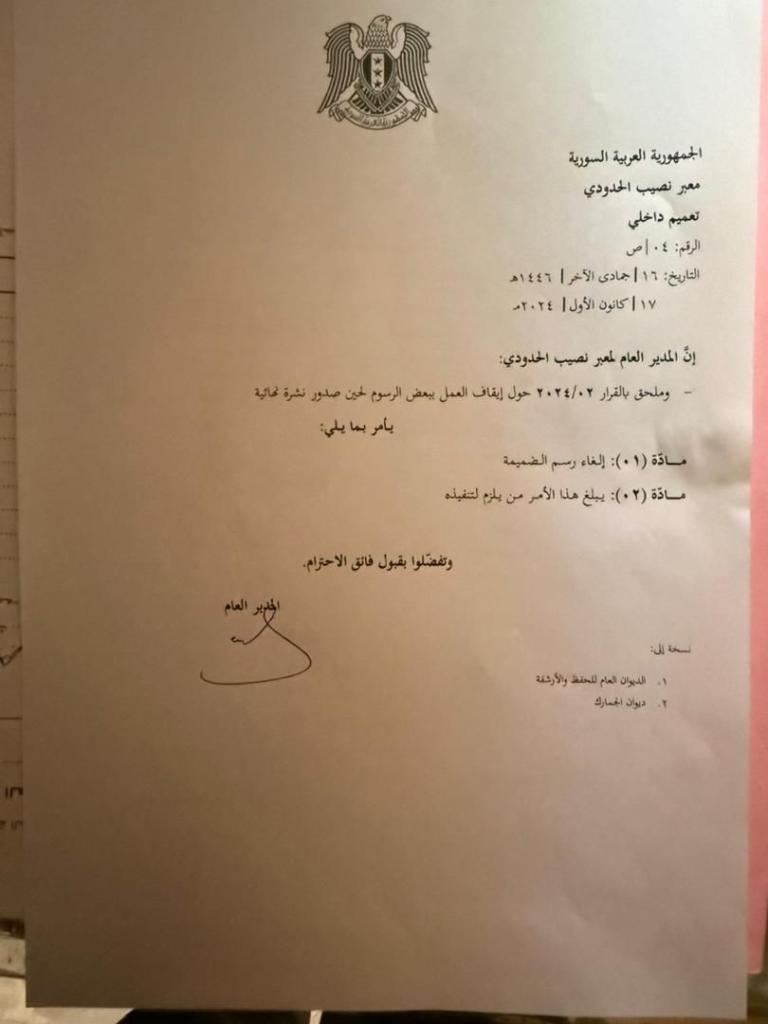 الجغبير:الجهات السورية قامت على إلغاء كافة جميع انواع الرسوم والطوابع